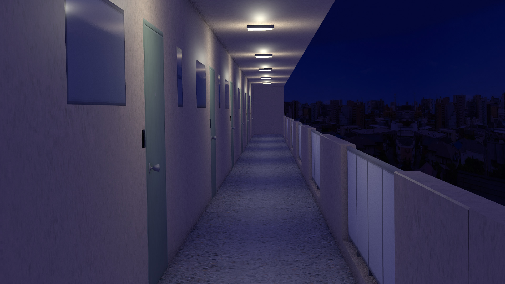 - Balcony and simple exterior hallway.