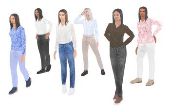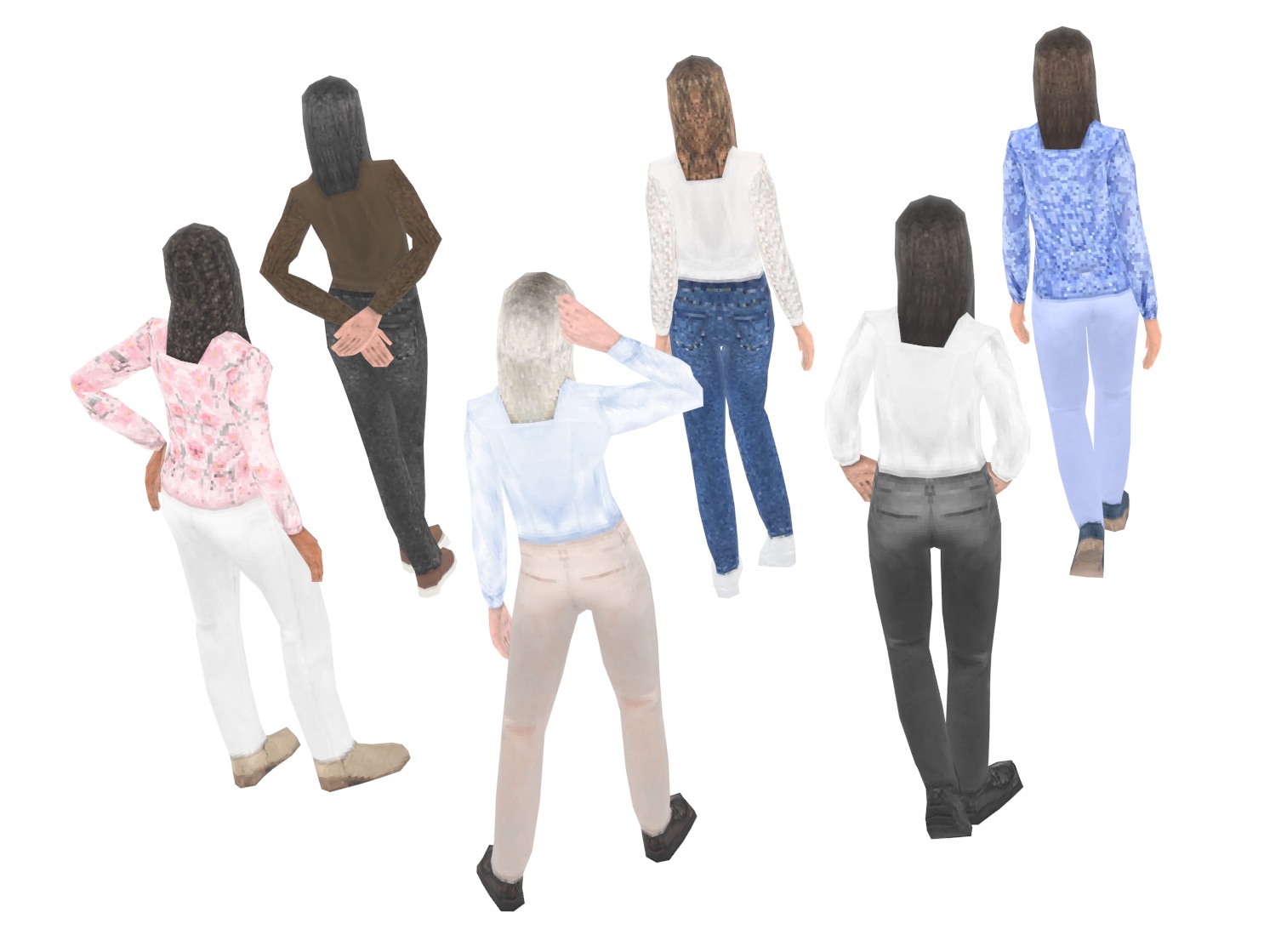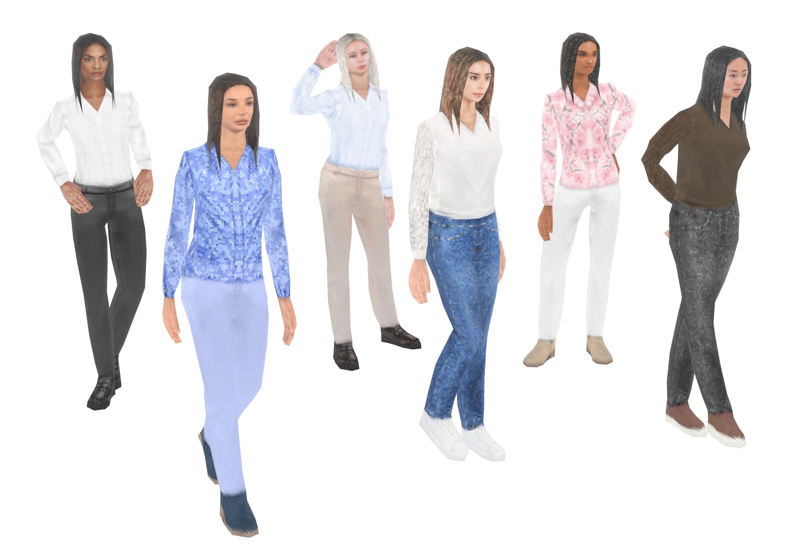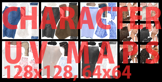 - 6 clothing textures (3 types and 2 colors each) and 6 heads.