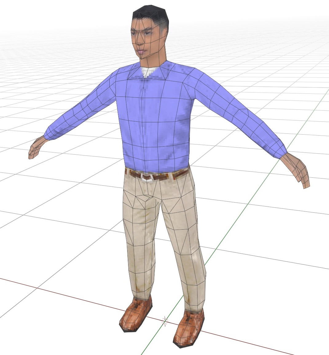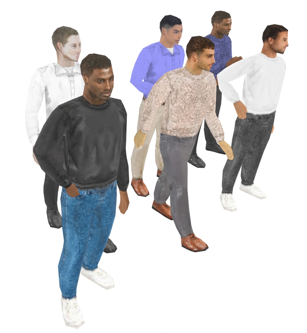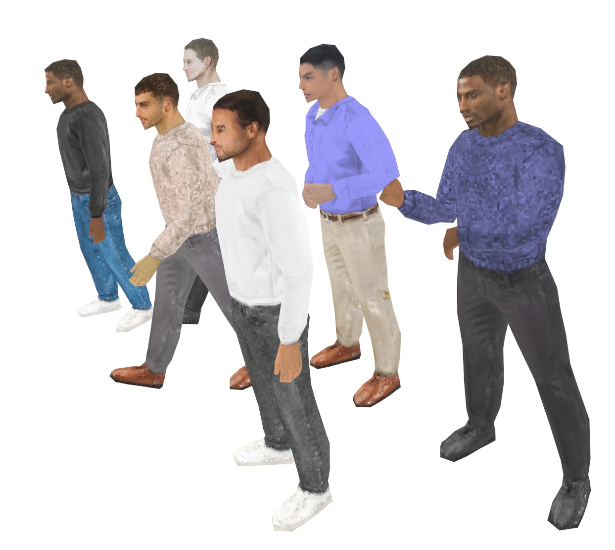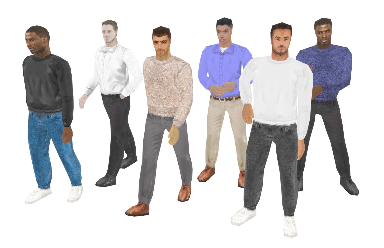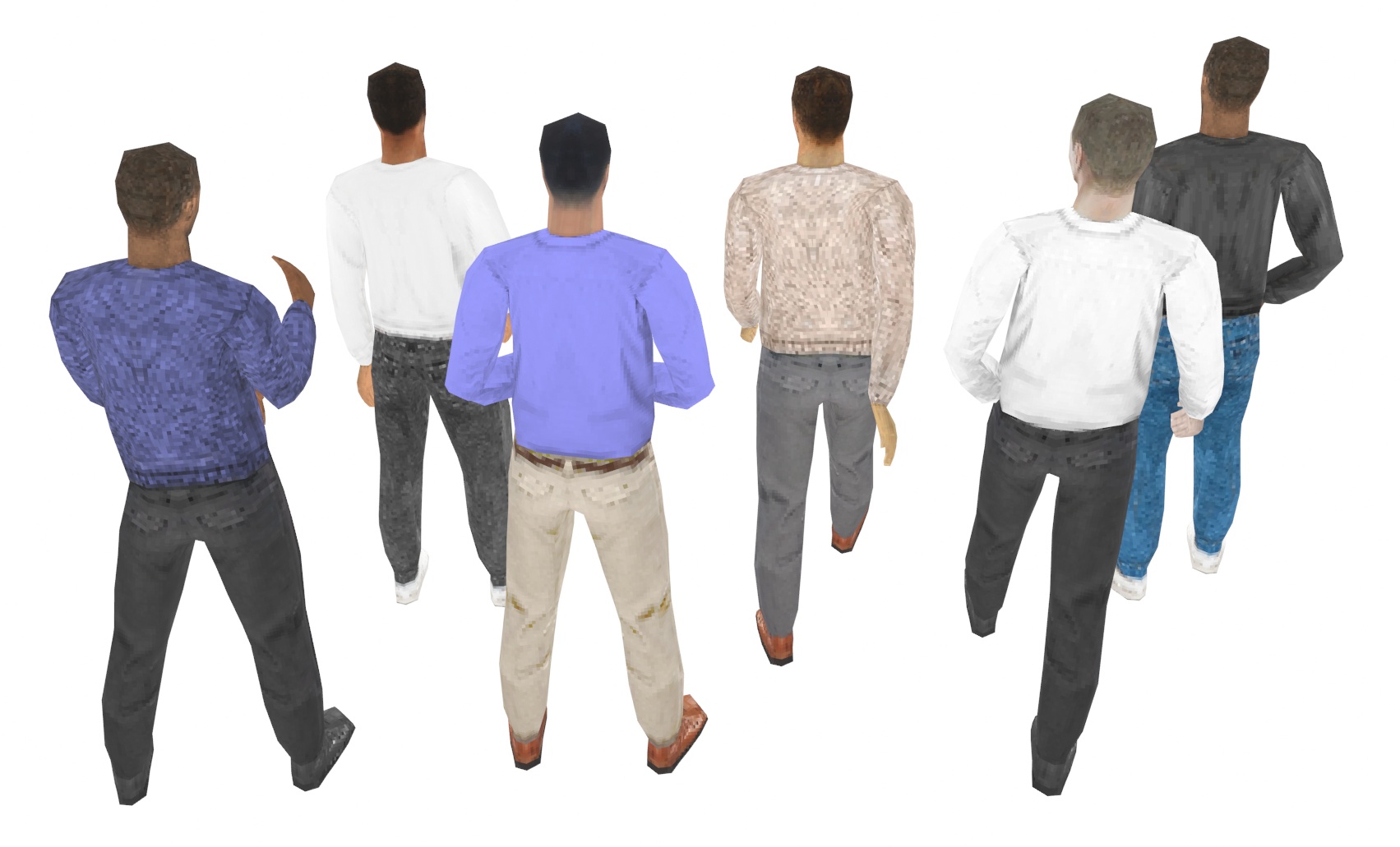 - 6 clothing textures (3 types and 2 colors each) and 5 heads.
