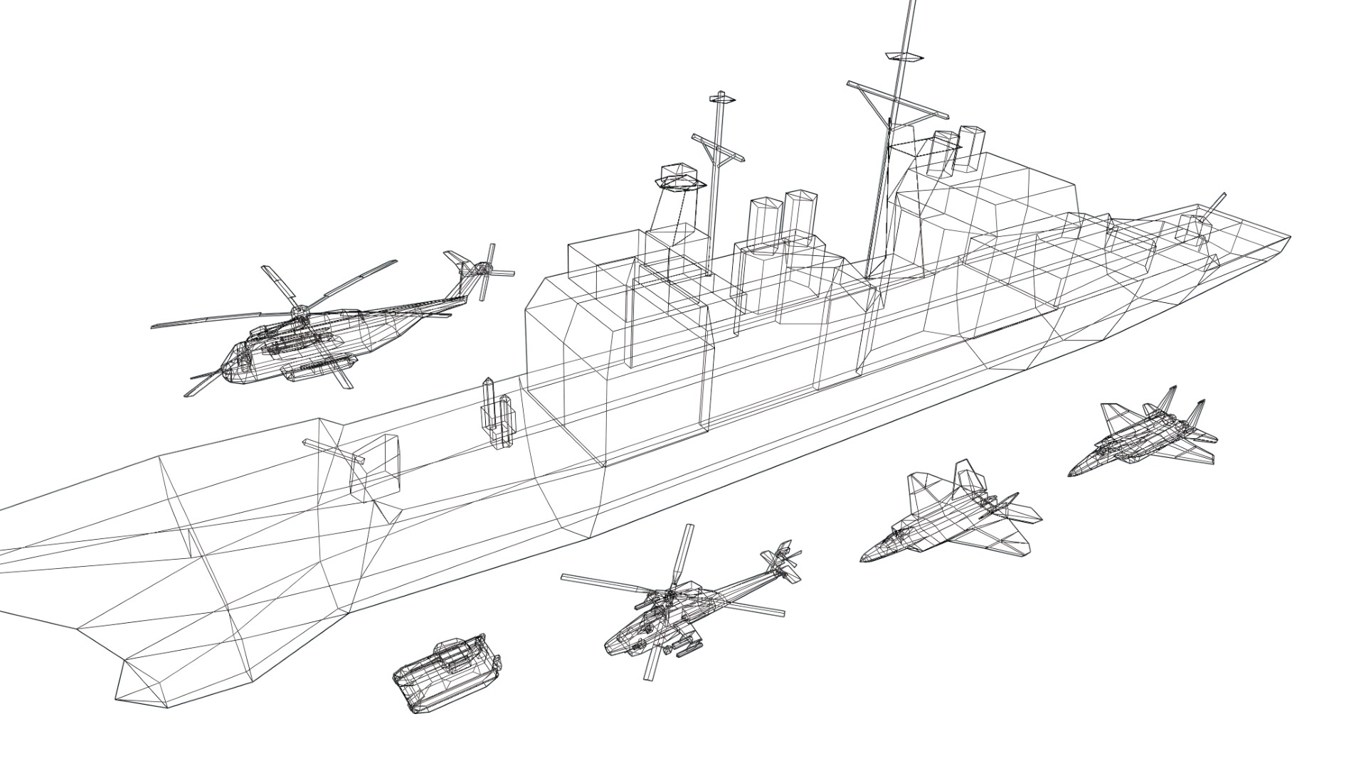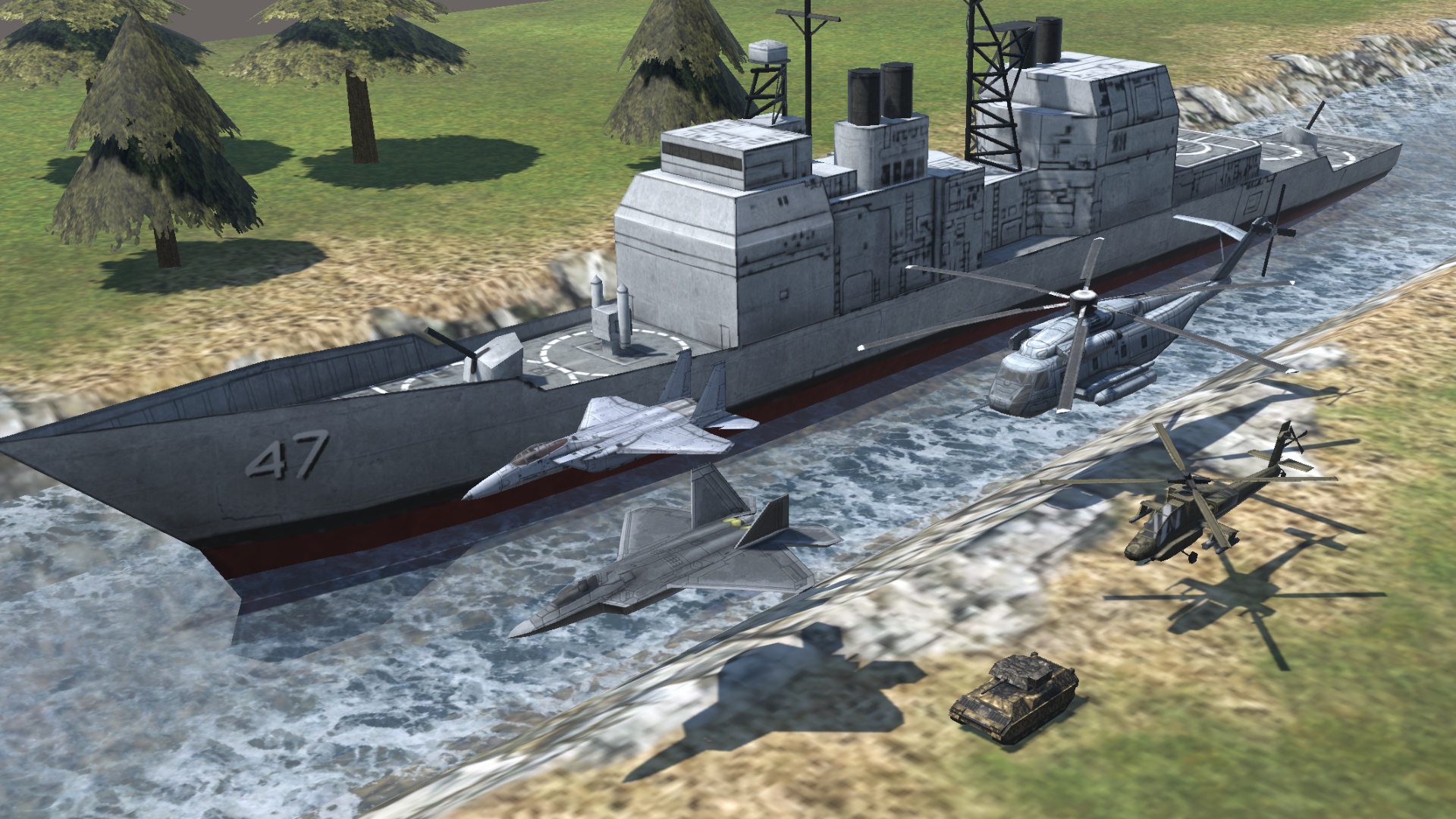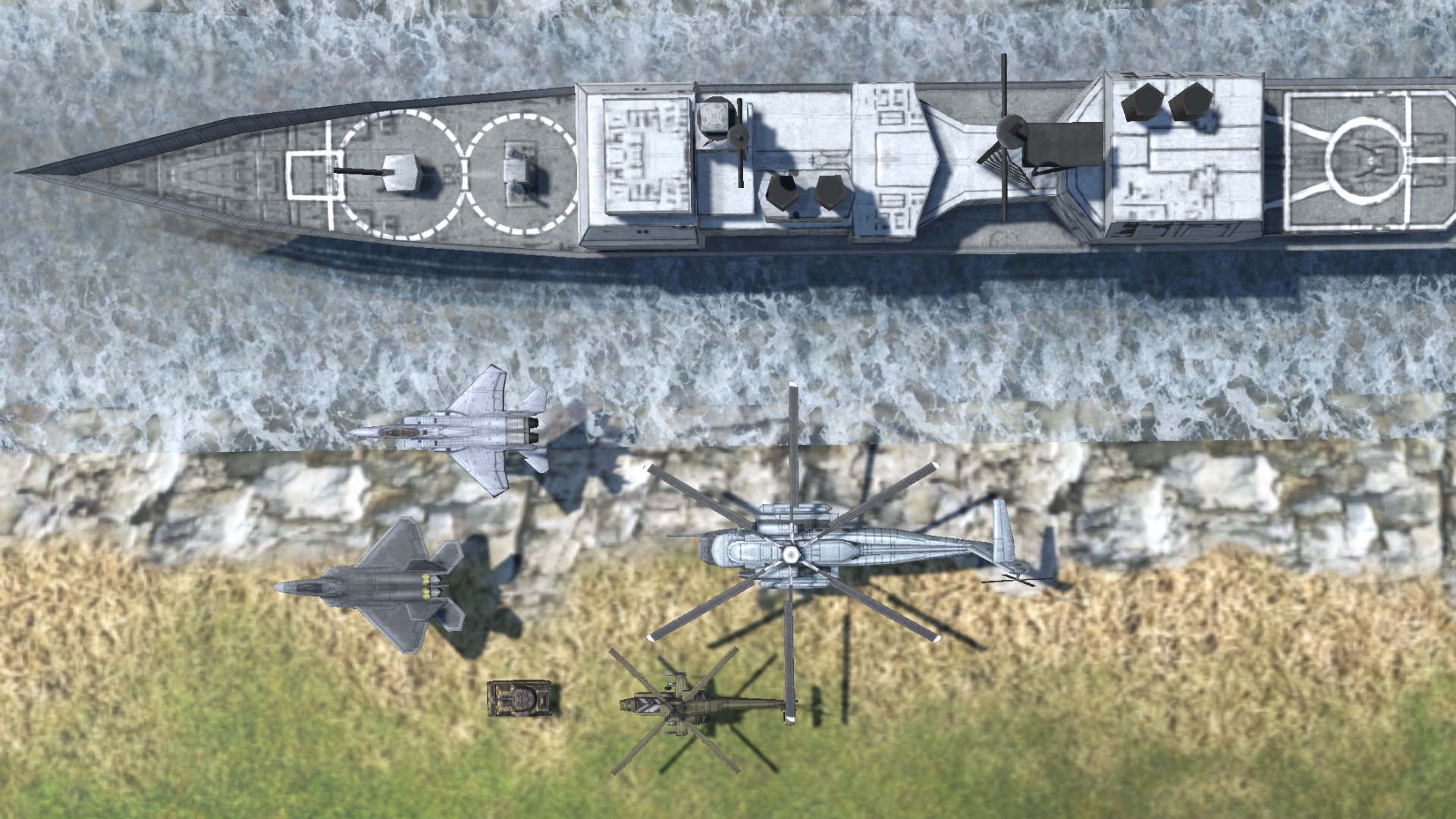 - Six vehicles: one cruiser ship, two helicopters, two fighter jets, and one tank.